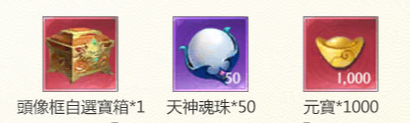 贈送:頭像框自選寶箱*1,天神魂珠*50,元寶*1000