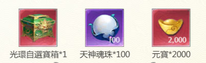 贈送:光環自選寶箱*1, 天神魂珠*100, 元寶*2000