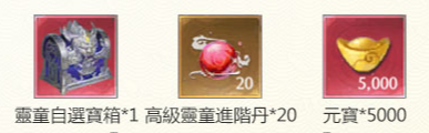 贈送:靈童自選寶箱*1, 高級靈童進階丹*20, 元寶*5000