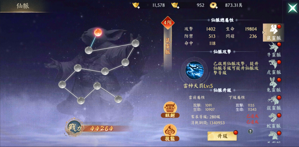 屬性提升:每次升級仙脈,均可為角色帶來永久性的大量基礎屬性提升(如:攻擊、生命、防禦等),是戰力構成的重要部分。