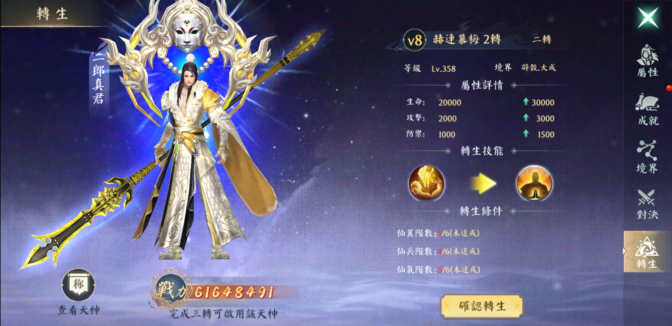 當角色達到一定等級並完成特定條件後,即可開啟「轉生」系統。轉生是突破當前境界、大幅提升角色能力的重要途徑。
